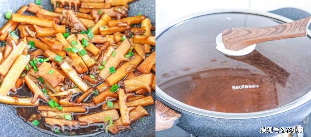 5、把调好的料汁倒入锅里,和冬笋搅拌一下,然后盖上锅盖,让它们在锅里煮上 3 分钟。时间差不多了,打开锅盖看看。最后撒上一把葱花点缀一下。夹上一筷子冬笋放进嘴里,那口感脆嫩,味道浓郁,既有冬笋本身的清甜,又有料汁的鲜香,简直太好吃了。
