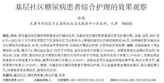 徐园.基层社区糖尿病患者综合护理的效果观察[J].中国城乡企业卫生,2025,40(04):228-230.