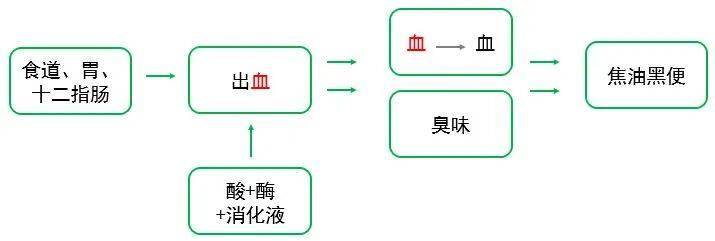 当食道、胃或十二指肠(小肠的第一部分)出血,红色的血液会在一些酸、酶和消化液的作用下变黑,同时产生有臭味的气体,混在便便中,便便也因此变得又臭又黑。