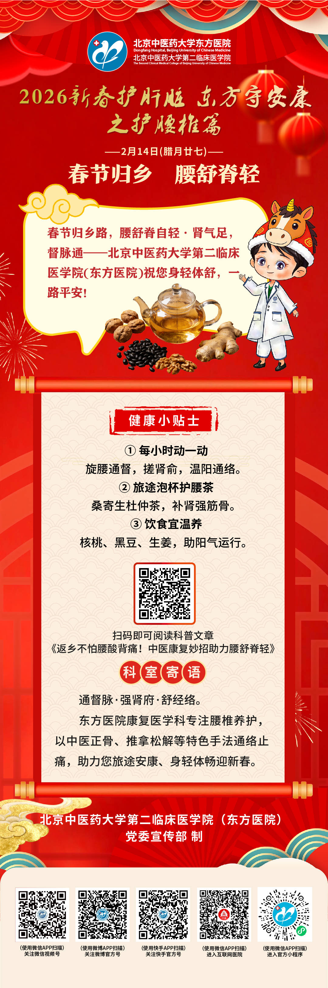 若腰已“报警”,及时到康复医学科评估,我们采用中医手法调整筋骨平衡、综合疗法温通经脉、个性化导引功法指导,从肾、督脉、膀胱经核心病机入手护腰,恢复脊柱活力。春节奔波,别忘了让腰“放假”。提前养护,途中放松,归来轻盈,这是回家的最佳状态。