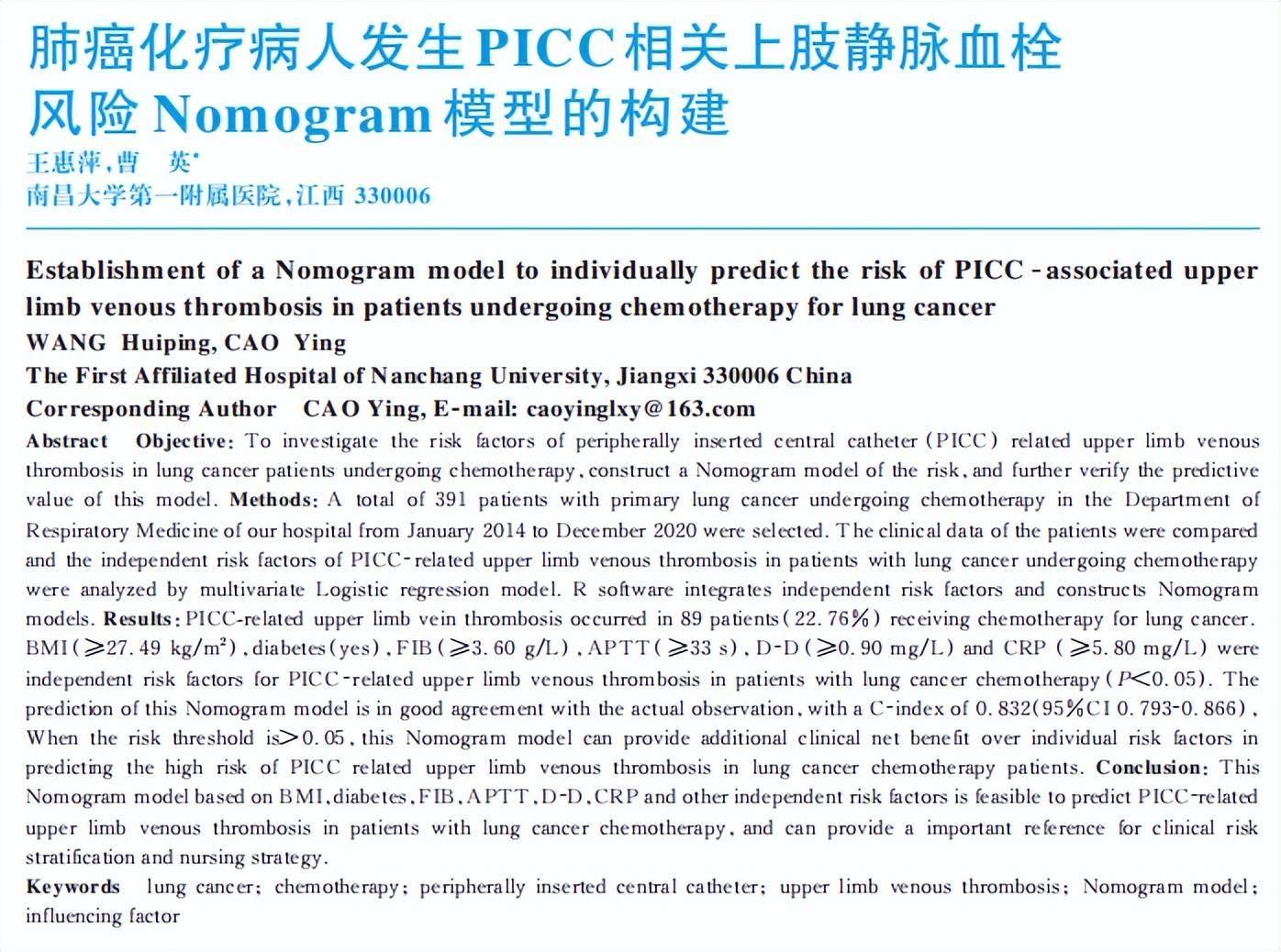 [1]王惠萍.肺癌化疗病人发生PICC相关上肢静脉血栓风险Nomogram模型的构建,护理研究,2024-08-02.