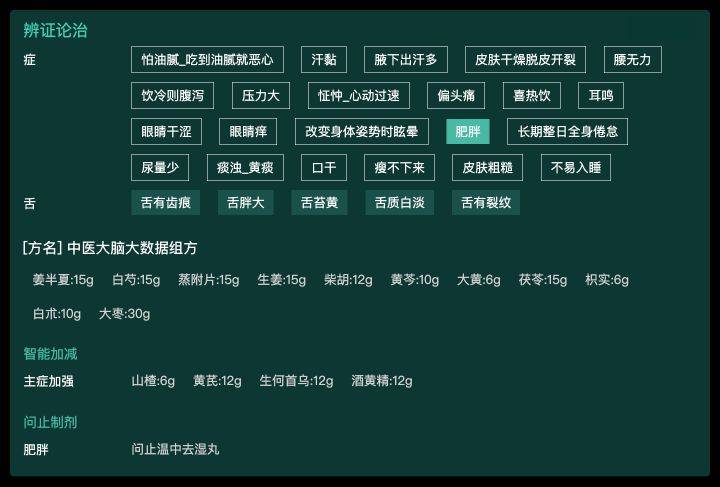 当然,不是所有肥胖者都千篇一律地用某一个方剂组合。在这个医案里,中医大脑会使用大柴胡汤结构和真武汤结构的合方,这是分析了患者的整体症状之后所设计出来的。所以,通过人工智能的不断运算比较,我们可以针对不同体质找到为患者量身订造的减肥方剂。