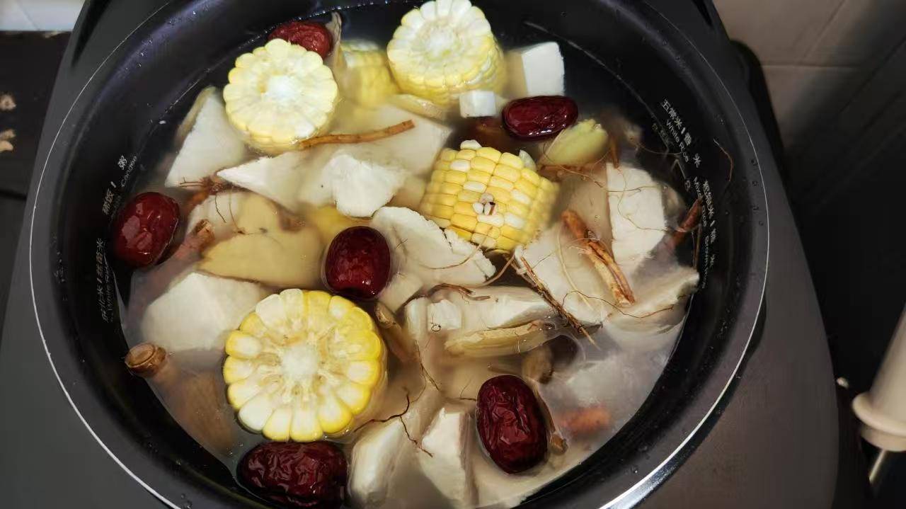 2、这里还搭配了几样辅助食材,新鲜玉米,红枣,五指毛桃,蜜枣,几样都分别洗好,需要切的切好。
