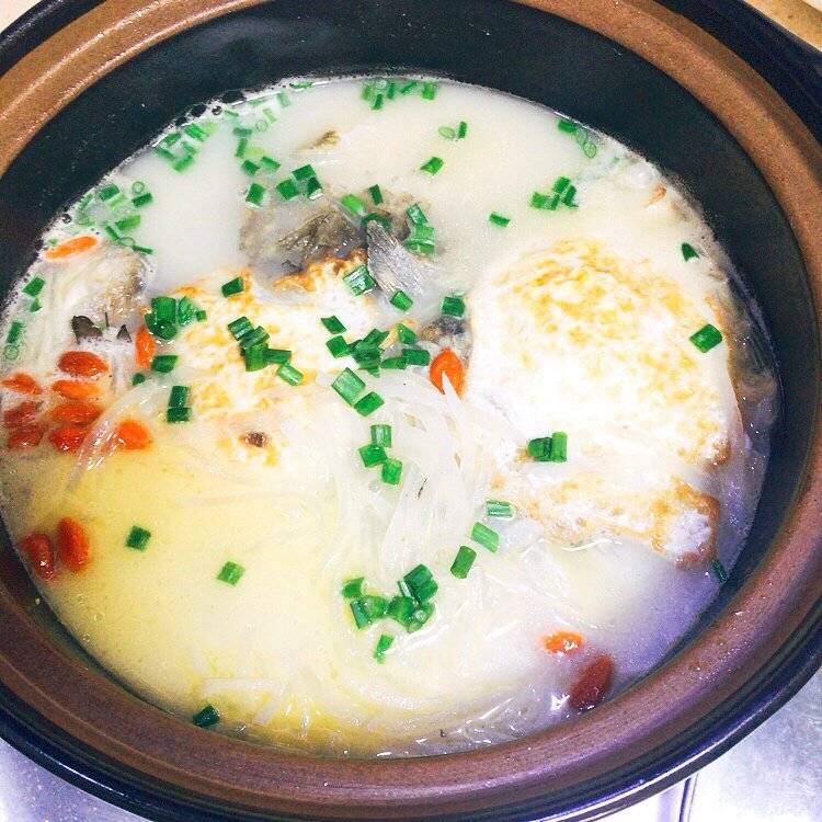 6、接着把鱼,萝卜都放到砂锅里,重新添上热水去煮,十五分钟之后,把荷包蛋再次放进去,挑选盐,葱花香菜都放里边,汤汁入味后,即可关火。