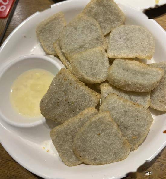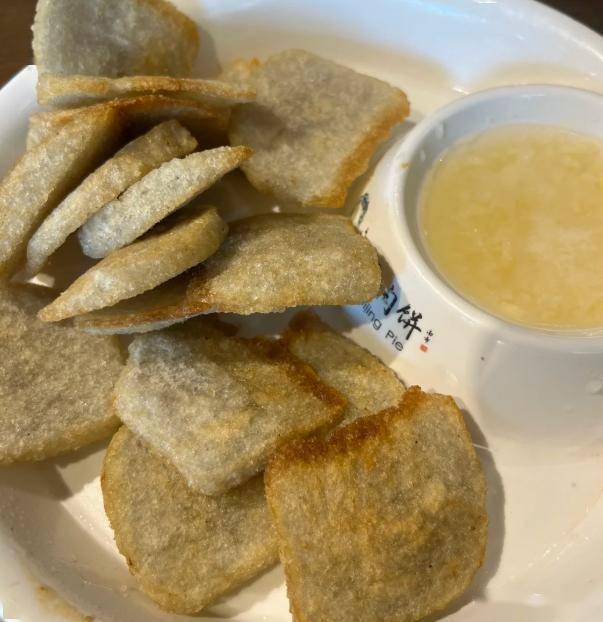 端上来一看,才发现是切得厚薄不均的淀粉片,炸得金黄,蘸着蒜汁吃。