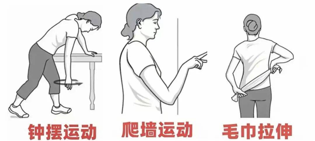 早期给予理疗、针灸、适度推拿,可改善症状;局点注射可缓解局限性疼痛;服用非甾体类抗炎药可缓解疼痛;通过居家康复锻炼,如钟摆运动、爬墙运动、毛巾拉伸等动作可促进功能康复。