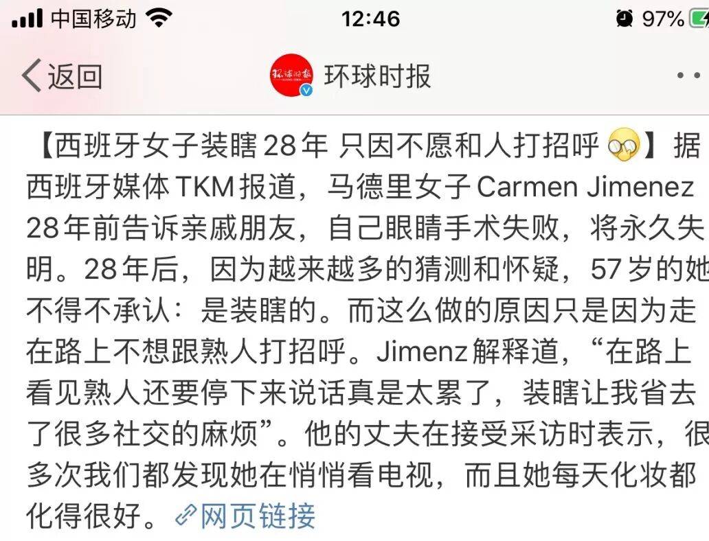 无独有偶,在西班牙,有一个女子为了避免和别人(包括自己的丈夫孩子)社交,从而“装瞎”28年……
