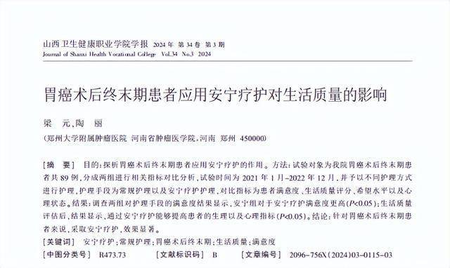 梁 元,陶 丽.胃癌术后终末期患者应用安宁疗护对生活质量的影响,山西卫生健康职业学院学报,2024