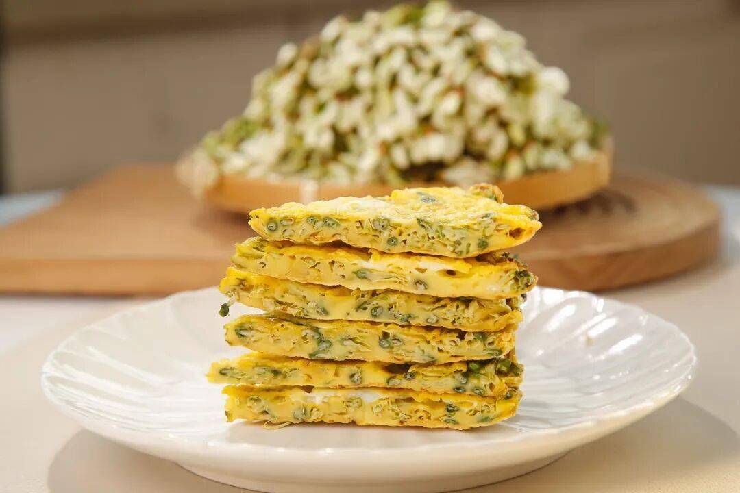 把洋槐花洗净沥水,切成碎末,和豆腐一起放在盆内,加入葱、姜末、盐、鸡蛋、淀粉调成馅。将馅做成圆饼,粘上一层芝麻,用油炸或煎熟就大功告成。洋槐花芝麻饼色泽金黄,口感鲜脆。