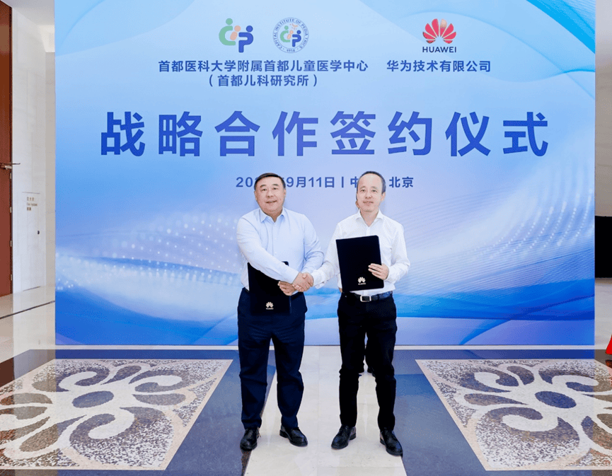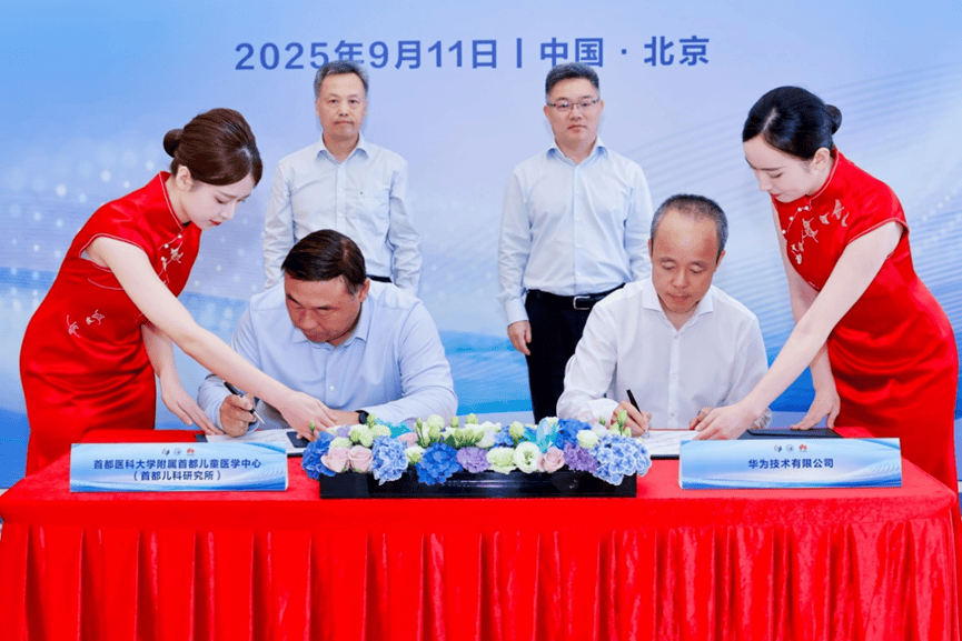 2025年9月11日,首都医科大学附属首都儿童医学中心(首都儿科研究所)与华为技术有限公司在北京签署战略合作协议。根据协议,双方将在智慧医院顶层设计、基于国产算力的儿科专病大模型、信创实验室联合创新及医疗信息化人才培养等领域展开深度合作,旨在推动首都儿童医学中心信息化建设高质量发展。首都儿科研究所所长张建与华为北京政企业务部部长宋保民代表双方签约,首都儿科研究所党委书记张金保、华为公司副总裁兼公共事业军团政委杨伟军出席仪式。首都儿科研究所相关职能处室负责人及华为北京政企医疗业务部门负责人等共同参加了签约仪式。