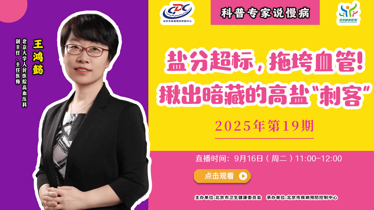 2025年第19期 #科普专家说慢病# 特邀北京大学人民医院高血压科副主任、主任医师王鸿懿,为您拆解高盐饮食的健康风险,手把手教你掌握控盐技巧,把心脑血管保护主动权握在手中!