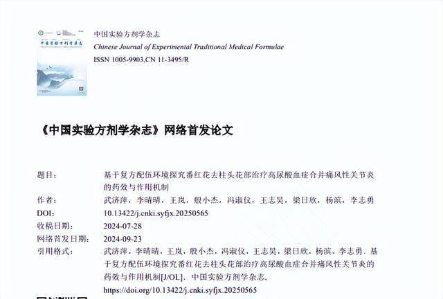 [1]武济萍,李晴晴,王岚,等.基于复方配伍环境探究番红花去柱头花部治疗高尿酸血症合并痛风性关节炎的药效与作用机制[J/OL].中国实验方剂学杂志,1-16[2024-10-07].