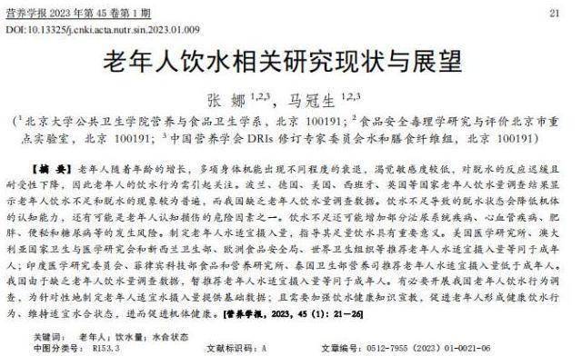 [1]张娜.老年人饮水相关研究现状与展望,营养学报,2023-02-28