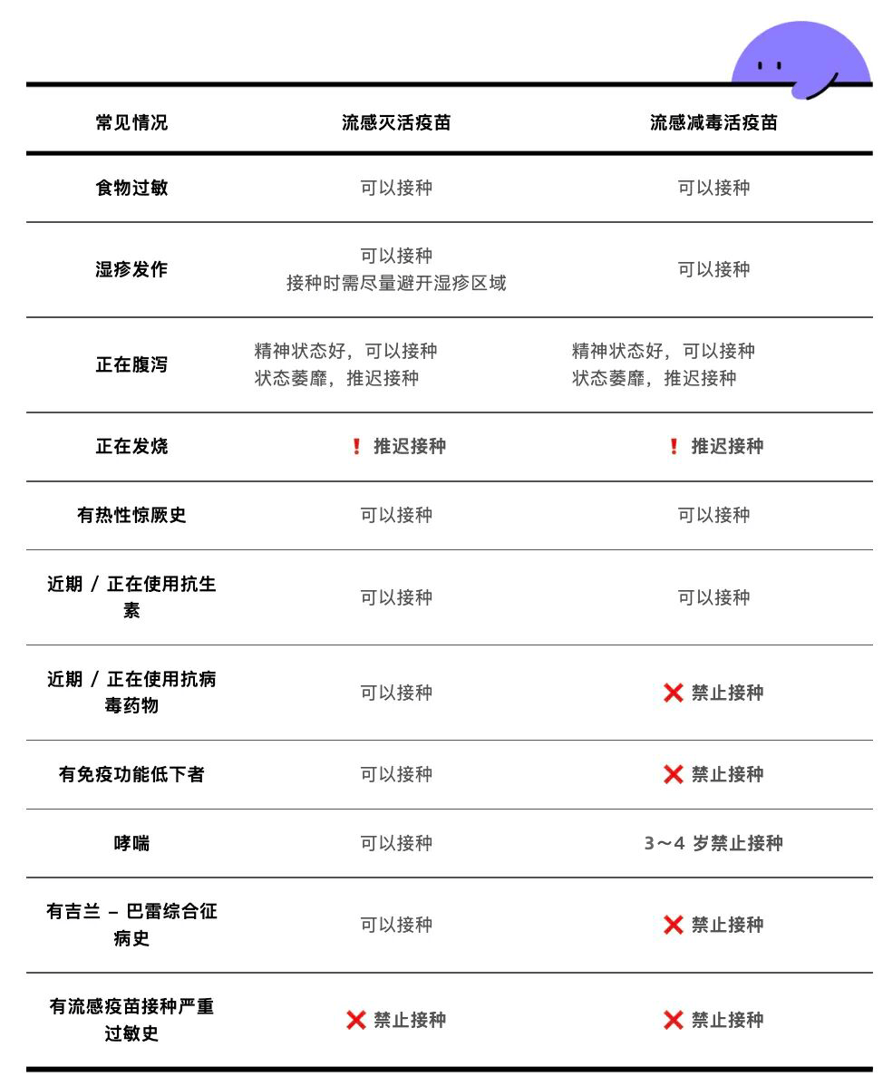 需要注意的是,尚不推荐对 3~4 岁患有活动性喘息或反复喘息发作的儿童接种鼻喷流感减毒活疫苗。