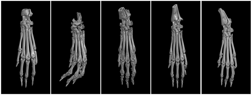 微型CT扫描健康小鼠、病变小鼠、低剂量六堡茶干预小鼠、高剂量六堡茶干预小鼠和阳性对照小鼠的后爪图像