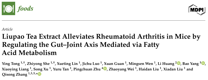近期,广西大学在《foods》发表题为“六堡茶提取物通过调节脂肪酸代谢介导的肠-关节轴缓解小鼠类风湿性关节炎”的论文。