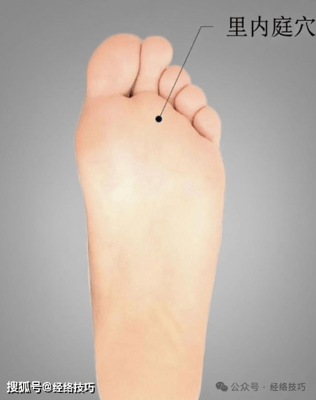 里内庭为一经外奇穴,它不在主要经络“之上”不过诸多老师都会予以运用。此穴处于脚底,大致在二、三脚趾缝“延伸”向脚心之时的中点位置。试着将脚趾往“内”勾动,在脚前掌处会有一个浅浅的凹陷,那便是里内庭。