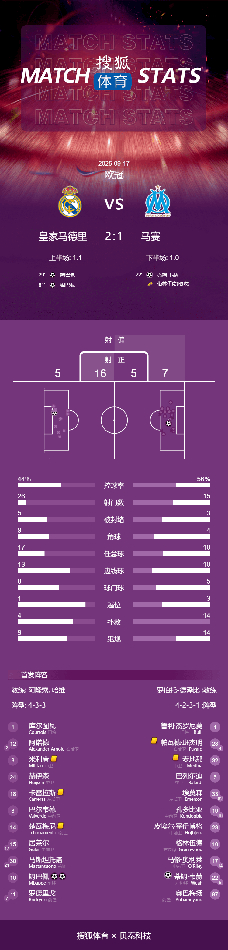 北京时间9月17日凌晨3点,2025-2026赛季欧冠联赛阶段第一轮展开一场焦点战役,皇马坐镇主场迎战马赛。上半场开场仅5分钟,阿诺德拉伤大腿肌肉被迫离场。格林伍德助攻,维阿率先为马赛取得领先。随后,罗德里戈造点,姆巴佩一蹴而就。下半场,卡瓦哈尔顶倒门将鲁利,被直红罚下。维尼修斯在禁区内造点,姆巴佩再次罚入点球,不过,这个判罚在赛后引起了巨大争议。最终,皇马在主场0-1落后的情况下2-1逆转战胜马赛,拿下新赛季欧冠首胜。