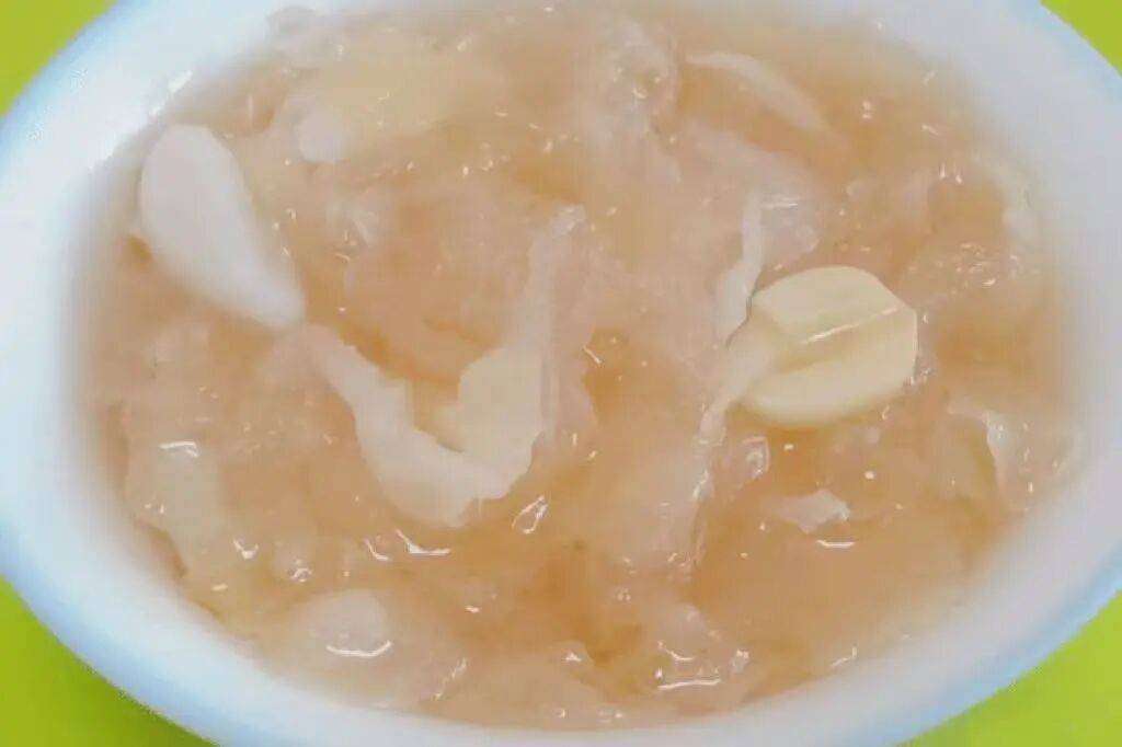 做法:银耳泡发后撕成小朵,与干百合、莲子、枸杞、红枣一同放入锅中,加足量水,大火烧开后转小火慢炖1-2小时,至银耳粘稠,出锅前加入冰糖调味。