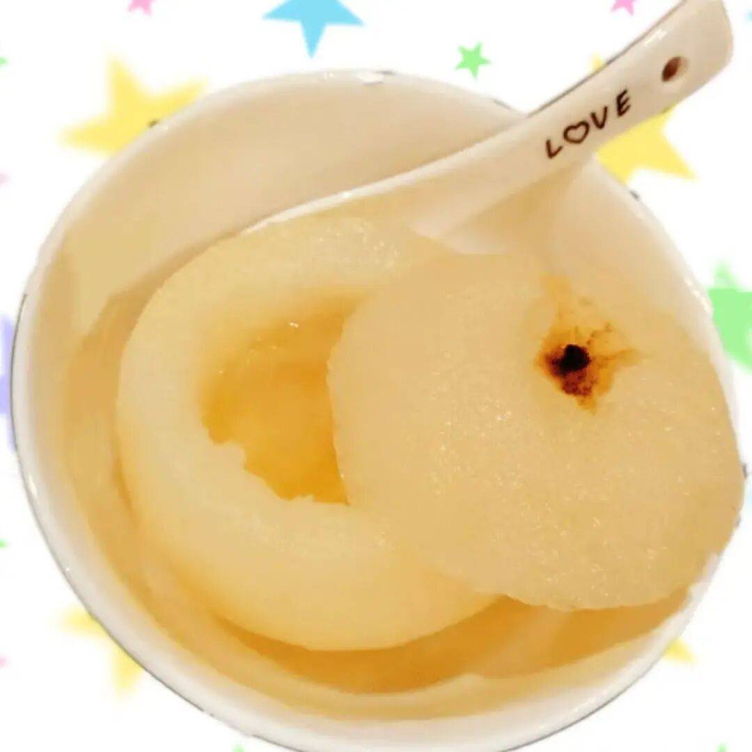做法:雪梨1个洗净,从上1/3处切开,挖去核,放入冰糖2-3粒,盖上“梨盖”,放入碗中隔水蒸 30分钟左右至梨软烂。