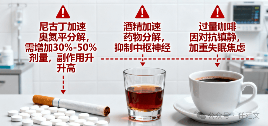 此外,服药期间接触烟酒、咖啡会削弱药效甚至引发风险:酒精会加速药物分解、与药物协同抑制中枢神经,还可能加重症状;烟草中尼古丁会加速奥氮平等药物分解,使吸烟患者需增加30%-50%剂量且副作用风险升高;过量咖啡因可能对抗药物镇静作用,加重失眠、焦虑。