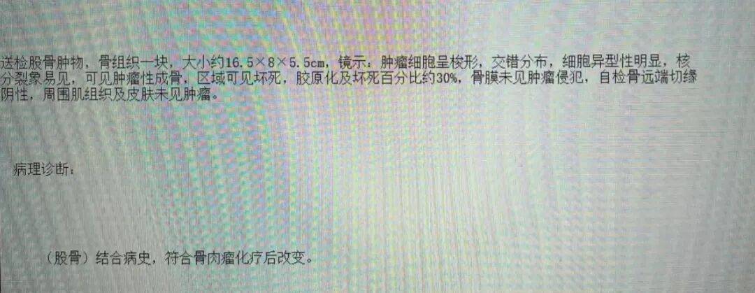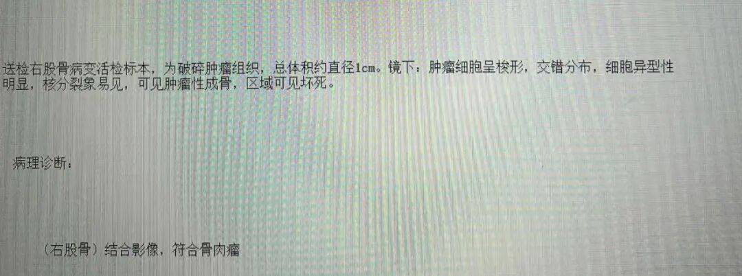 小宇随即被收治进了浙大儿院莫干山院区骨科病房。几天后的活检病例结果显示:(右股骨)结合影像,符合骨肉瘤。