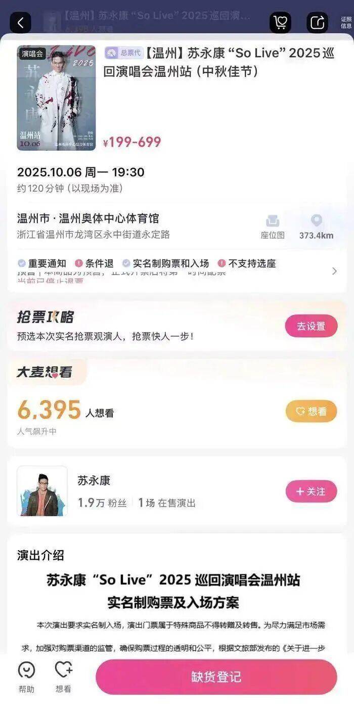 9月17日,羊城晚报记者在大麦APP搜索发现,苏永康暂无在售演出。据红星新闻,演出主办方已向审批单位提交取消申请。此前大麦网平台显示,苏永康“So Live”2025巡回演唱会温州站(中秋佳节)将于10月6日在温州奥体中心体育馆举办,票价为199元至699元不等,所有门票已经售罄。