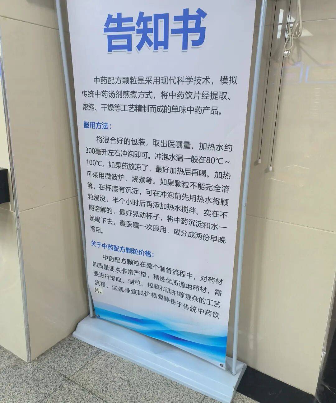 ◎ 某三甲医院药房入口处摆放易拉宝介绍中药配方颗粒。/ 图:作者摄