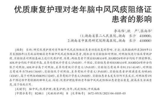 李冯伟.优质康复护理对老年脑中风风痰阻络证患者的影响,中医药导报,2021-04