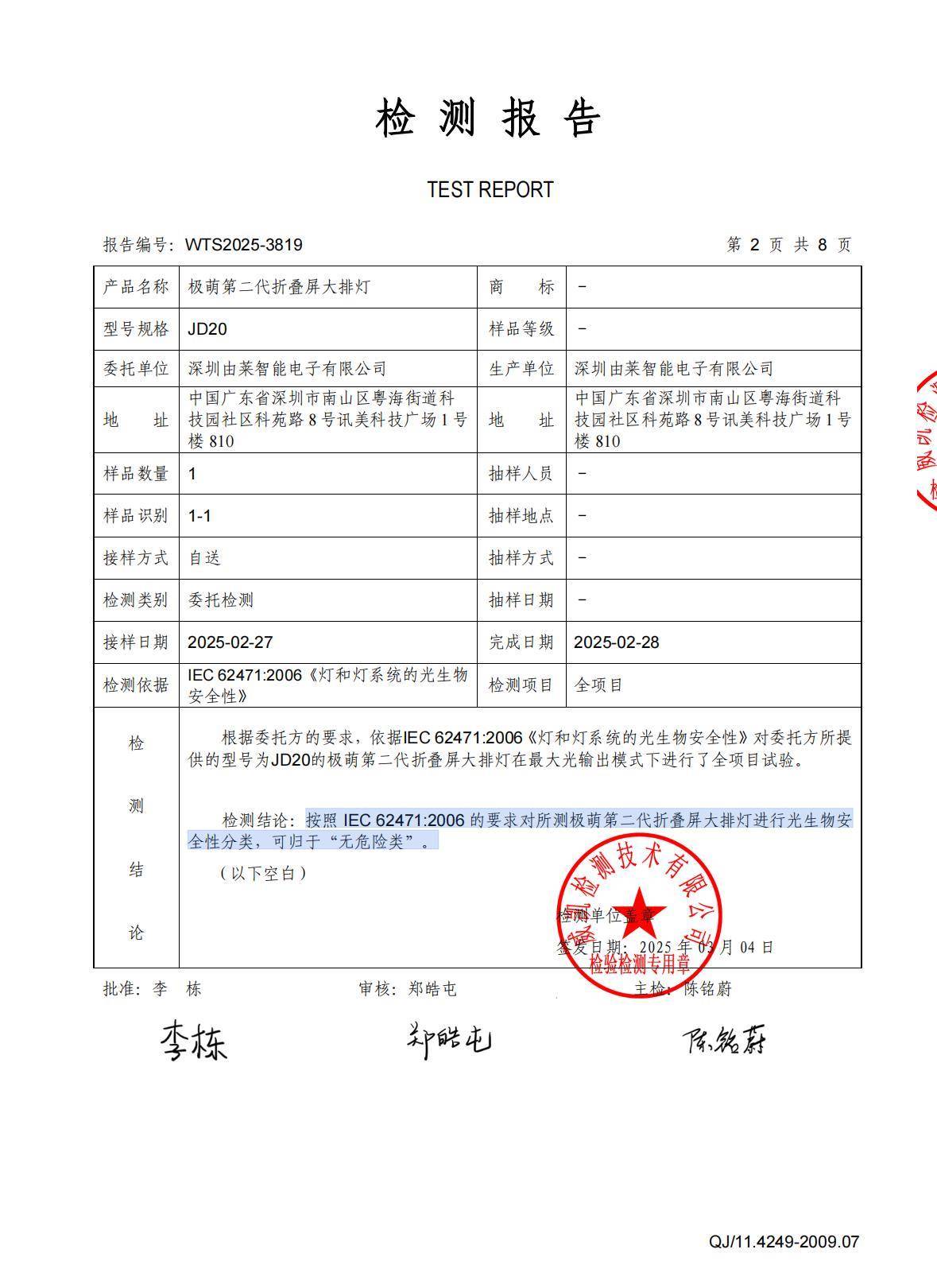 9月16日,极目新闻记者就王女士遭遇及相关消费者反馈致电极萌品牌方。品牌方回应称,产品是有测试过安全项以及护目镜的光波报告的。对于该消费者提供的病历,无法判定是因为使用了该司产品直接导致的。随后品牌方向记者出示了极萌第二代折叠屏大排灯的检测报告,检测结论为:按照 IEC 62471:2006 的要求对所测极萌第二代折叠屏大排灯进行光生物安全性分类,可归于“无危险类”。