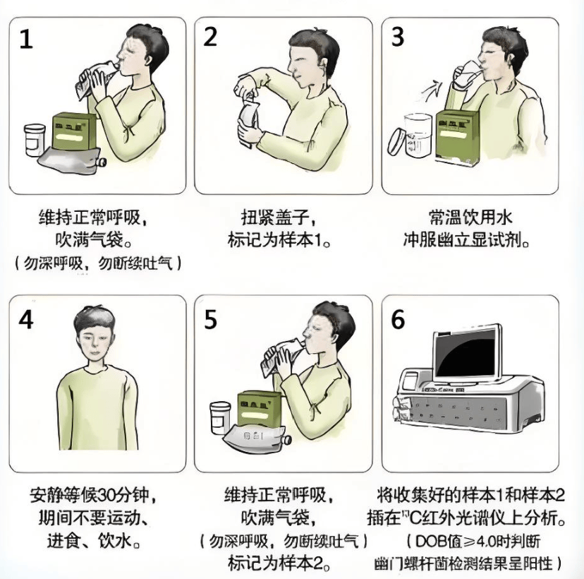 检测幽门螺杆菌首选推荐非常简单实用的是碳13或碳14呼气试验。吹两口气,轻松又准确,是诊断的“金标准”。