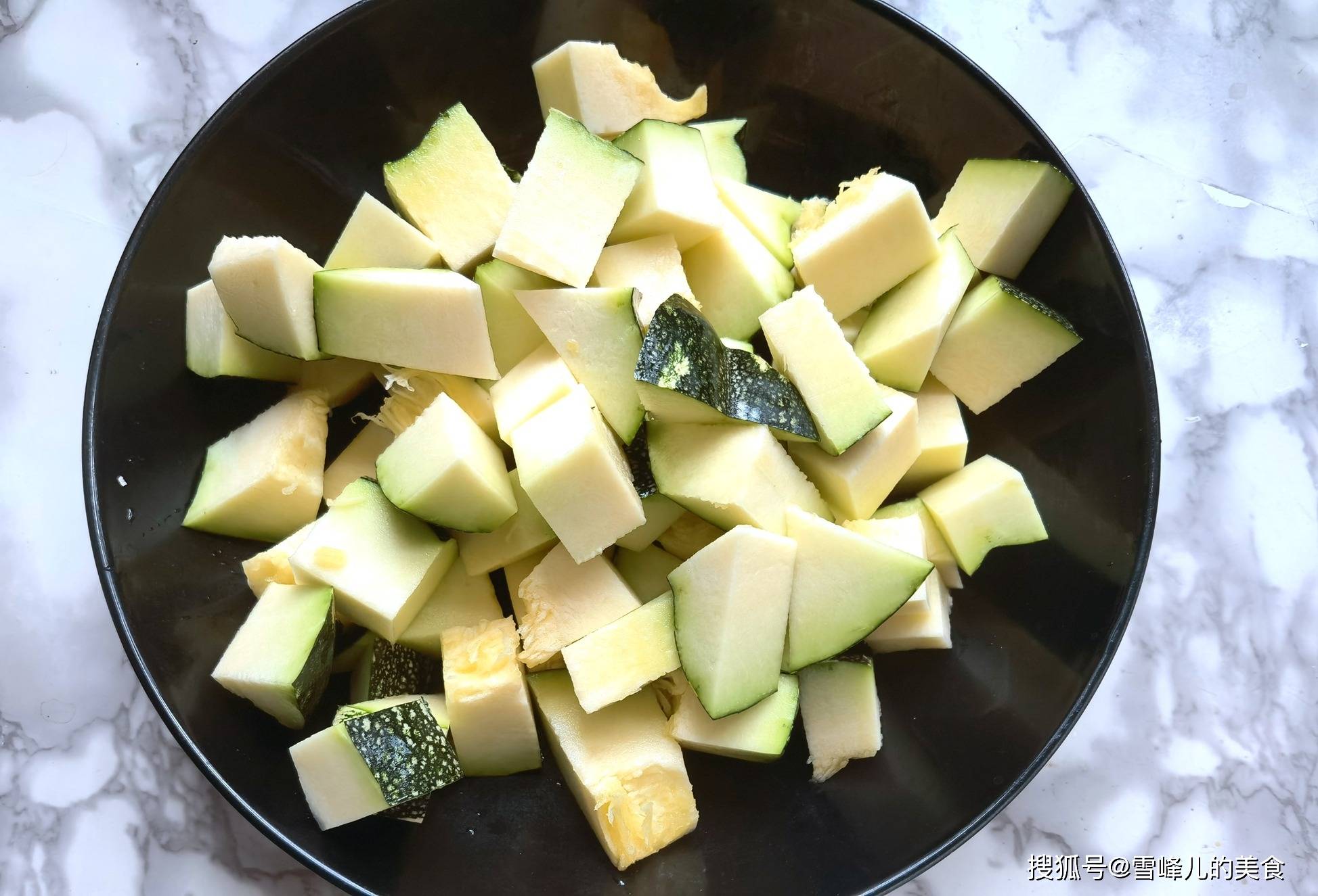 第一步:南瓜用这种黄色的南瓜,把南瓜去皮去籽,切成小丁,南瓜一定要多一些,切的小一点,不然豆浆机放不了几块就满了,南瓜汁也很难打的浓稠。