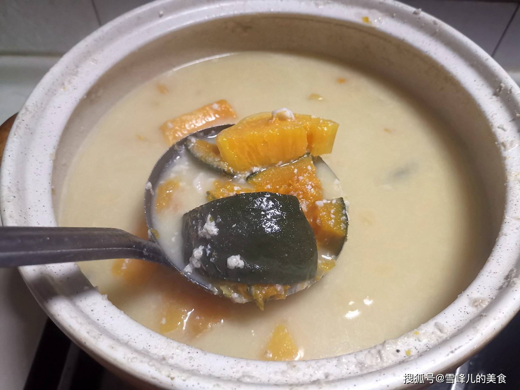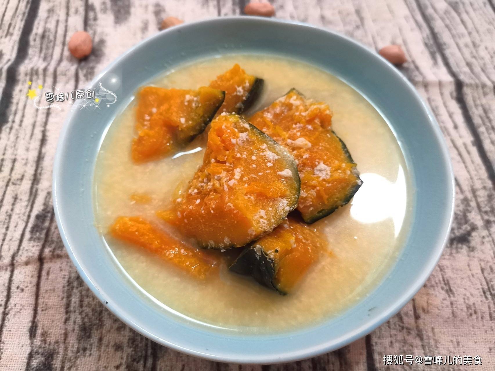 【花生南瓜汤做法】食材:贝贝南瓜1个,花生适量,盐少许