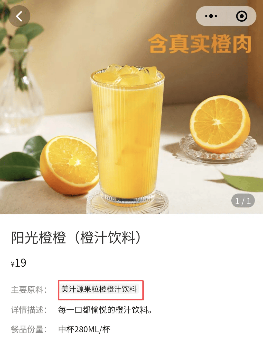在某外卖平台上搜索必胜客此款商品,发现商品详情处标注信息:主要原料为美汁源果粒橙橙汁饮料。
