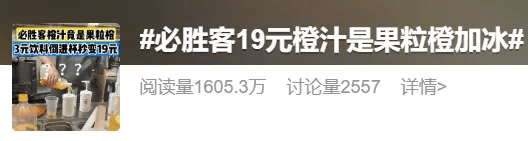据查,市面上一瓶450ml的果粒橙卖3元左右,而必胜客同款橙汁只有280ml却卖19元。