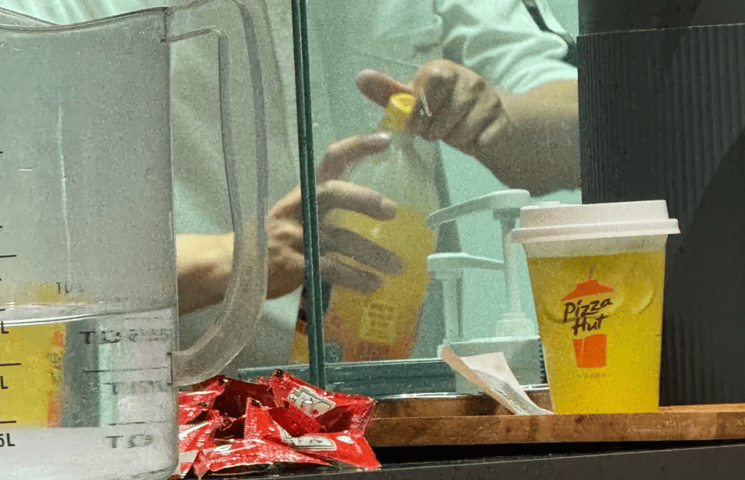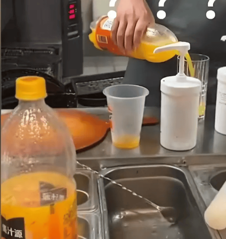 近日,有网友称,在必胜客花19元点了一杯橙汁,发现店员直接将大瓶的果粒橙倒入玻璃杯中完成制作。
