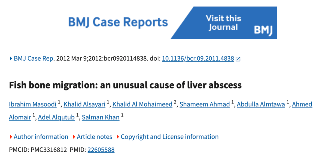 诊断与治疗:医生推测正是这个异物引发了肝脓肿,并且也很可能是一个月前那次病灶的元凶。于是,他们先给予抗生素治疗,再行剖腹探查手术(laparotomy)。结果发现,那根神秘的异物竟是一根鱼刺。