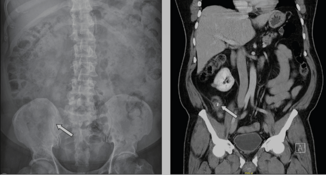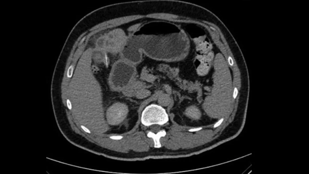 进一步检查:第二次入院时,血检发现白细胞计数升高(提示感染),白蛋白水平低于正常(肝脏合成蛋白的能力下降)。腹部X光并未发现异常,但CT扫描结果却让医生们大吃一惊。肾脏、脾脏、胰腺和胆囊一切正常,但在肝脏中央区域有两处异样:一处是类似脓肿的病灶,另一处竟有一个坚硬的“树枝状”异物,长度约2.5厘米。