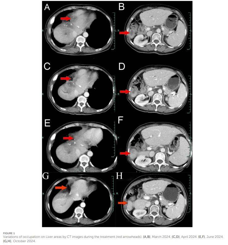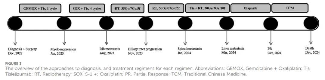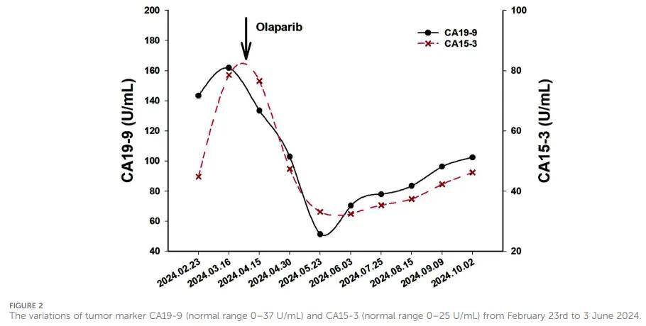 患者女,62 岁,中国人,因右上腹阵发性疼痛近 1 个月,于 2022 年 12 月 24 日入住衢州市人民医院。患者无吸烟、饮酒史,无重大合并症,无癌症家族史。次日,腹部增强计算机断层扫描(CT)显示肝右叶可见一大小约 6.1×4.9 cm的类肿块状低密度影,伴远端肝内胆管轻度扩张。胸部CT及头颅增强磁共振成像(MRI)未见转移征象。随后,患者于 2022 年 12 月 29 日接受扩大解剖性肝中叶切除术(包括IV段、V段、VIII段及尾状叶腔静脉旁部分),联合第一、二肝门血管切除及胆道狭窄重建(右前、后胆管部分切除整形),并行肝十二指肠韧带淋巴结清扫术。手术顺利完成,达到R0切除(切缘阴性)。术后病理及免疫组化检查确诊为中分化胆管癌。免疫组化结果如下:CK7(阳性)、CK19(阳性)、CK20(阳性)、CK18(阳性)、Hepatocyte(阴性)、AFP(阴性)、GPC-3(阴性)、CD34(阴性)、CD10(局灶阳性)、CDX-2(阴性);Ki-67(阳性,60%),PD-L1表达 <1%。下一代测序(NGS)结果如下:BRCA1(外显子10,p.Q1111fs,变异丰度:19.7%)、PALB2(外显子9,p.E956*,变异丰度:19.8%)及TP53(外显子5,p.Q165fs,变异丰度:33.6%)。根据美国癌症联合委员会(AJCC)第 8 版分期标准,诊断为胆管癌,分期为T4NxM0。患者于 2023 年 1 月 28 日接受首次术后免疫联合化疗,方案为替雷利珠单抗(静脉注射 200 mg)+吉西他滨(第 1 天 800 mg/第 8 天 600 mg,静脉注射)+奥沙利铂(第 1 天100 mg,静脉注射)。然而,由于出现严重骨髓抑制,患者随后接受了 4 个周期的替雷利珠单抗(第 1 天静脉注射200 mg,每 14 天为 1 周期)、替吉奥(第 2-15 天静脉注射 400 mg,每 14 天为 1 周期)及奥沙利铂(第 1 天静脉注射 100 mg,每 14 天为 1 周期)治疗。因右侧胸痛 1 周,患者于 2023 年 8 月 8 日复查胸部CT,结果显示右侧第 7 肋骨增厚、密度增高,伴周围软组织肿胀。患者随后接受该区域立体定向体部放疗(SBRT),处方剂量 35 Gy/5 次(每次7 Gy)。2023 年 11 月 11 日腹部CT显示肝内胆管轻度扩张,随后患者接受放疗方案 50 Gy/2 Gy/25 次。因频繁腰痛,患者于 2024 年 1 月 23 日接受腰椎MRI检查,结果显示胸1、胸6-11及腰椎多发斑片状影。随后,患者接受单剂量替雷利珠单抗(200 mg)治疗,并后续接受立体定向体部放疗,方案为 30 Gy/10次(每次 3 Gy)。不幸的是,2024 年 3 月 15 日腹部CT显示多发新增转移灶(图1A、B)。鉴于NGS结果、患者ECOG体力状况评分 2 分,以及其强烈希望继续积极治疗的意愿,启动了奥拉帕利挽救治疗,该药为口服BRCA靶向PARP抑制剂,剂量为 150 mg每日 2 次。随后于 2024 年 4 月 30 日(图1C、D)及 2024 年 6 月 4 日(图1E、F)进行的腹部CT检查显示肿瘤缩小,根据RECIST 1.1标准达到部分缓解(PR)。患者维持PR状态,无影像学进展,直至 2024 年 10 月因经济原因停止奥拉帕利治疗并转为中药治疗(图1G、H)。重要的是,患者对奥拉帕利耐受性良好,整个治疗过程中未报告治疗相关不良事件。同时,奥拉帕利治疗期间观察到肿瘤标志物CA199和CA153显著下降(图2),患者体力状况亦有所改善。不幸的是,患者于 2024 年 12 月因肺炎继发II型呼吸衰竭去世。诊断过程、治疗方案及靶病灶变化的总结见图3。