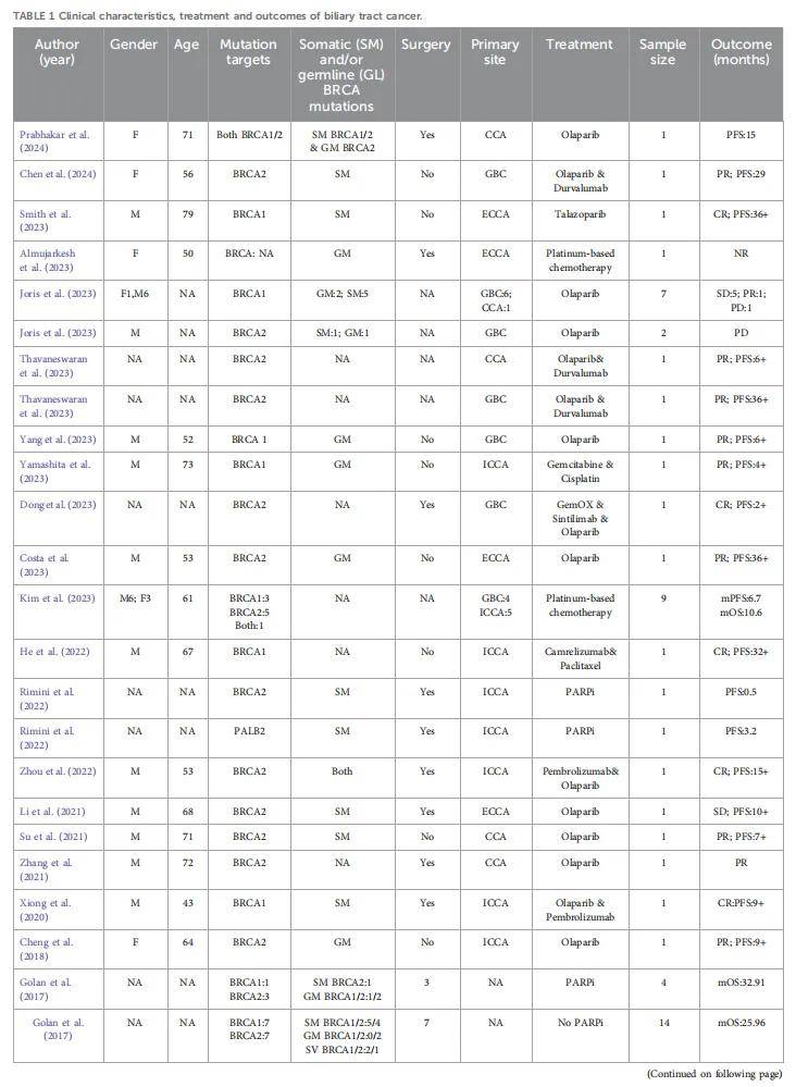 近年来,随着越来越多关于携带BRCA致病性变异的BTC研究报道,靶向治疗在其治疗中占据了重要地位。这一进展对于晚期治疗选择有限的BTC患者而言令人鼓舞,提示BTC也可能从PARPi中获益。通过在Medline和Embase数据库中使用关键词“BRCA”“BRCA1”“BRCA2”“PALB2”“胆管癌”“胆道癌”和“胆囊癌”进行检索,共纳入 22 项研究,涉及 56 例BTC病例(表1)。这是迄今为止规模最大、最新的综述,涵盖了2015年至2024年发表的病例。如表1所示,患者年龄范围为 39-79 岁,男女比例为 24:9,其中32 例年龄不明,23 例性别不明。致病性变异分布包括 12 例体细胞BRCA1致病性变异(sBRCA1m)、10 例体细胞BRCA2致病性变异(sBRCA2m)、5 例胚系BRCA1致病性变异(gBRCA1m)、7 例胚系BRCA2致病性变异(gBRCA2m)、1 例体细胞PALB2致病性变异(sPALB2m)、3 例BRCA结构变异、1 例BRCA1/2双致病性变异、1 例胚系及体细胞BRCA2致病性变异,以及 15 例未提供详细信息的BRCA致病性变异。大多数患者接受PARPi单药治疗或联合免疫治疗,较少接受铂类化疗。有趣的是,5 例CR患者中有 4 例的治疗方案包含PD-1抑制剂和PARPi,其中 2 例接受帕博利珠单抗联合奥拉帕利治疗。此外,Nicholas Prabhakar还报道了 1 例携带BRCA1和BRCA2共致病性变异的胆管癌(CCA)患者,接受奥拉帕利治疗后获得了 15 个月的PFS。Margherita Rimini则报道了 1 例携带sPALB2m的iCCA患者,接受PARPi单药治疗后PFS为 3.2 个月。为进一步说明PARP抑制剂的应用,表2总结了奥拉帕利在其他BRCA/HRD驱动型癌症中的关键III期试验——包括HRD阳性乳腺癌(OLYMPiAD试验)、胰腺癌(POLO试验)和BRCA1/2突变前列腺癌(PROfound试验)——这些试验均显示无进展生存期和总生存期显著改善。