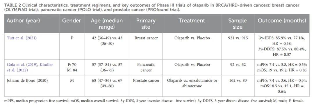 ▲表2 奥拉帕利在BRCA/HRD驱动癌症中的III期试验的临床特征、治疗方案和关键结果