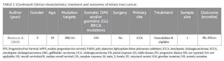 本病例报告存在一定局限性。首先,其结果的推广性可能受限,且由于病例报告的性质,观察到的结局可能具有偶然性。其次,未对该患者进行HRD评估,因为目前HRD评分标准尚未达成共识,且不同检测方法的参数标准存在差异,进一步增加了结果的变异性和不确定性。此外,患者疾病进展迅速且伴有多发肿瘤转移,严重限制了后续治疗选择。鉴于奥拉帕利治疗BRCA致病性变异BTC的相关报道病例较少,且患者具有强烈的生存意愿,最终采用奥拉帕利挽救治疗并达到部分缓解。最后,携带BRCA致病性变异的BTC的最佳治疗策略尚未确立。