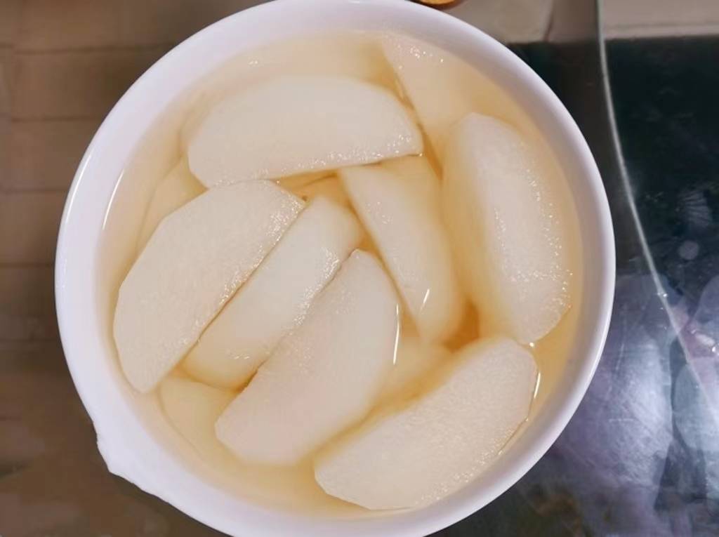 1、选择自己喜欢的梨,洗过之后,把皮削掉,先从中切开,果核剃除,进一步切成小块。先用盐水泡一会儿,这样可以保持洁白不变色。