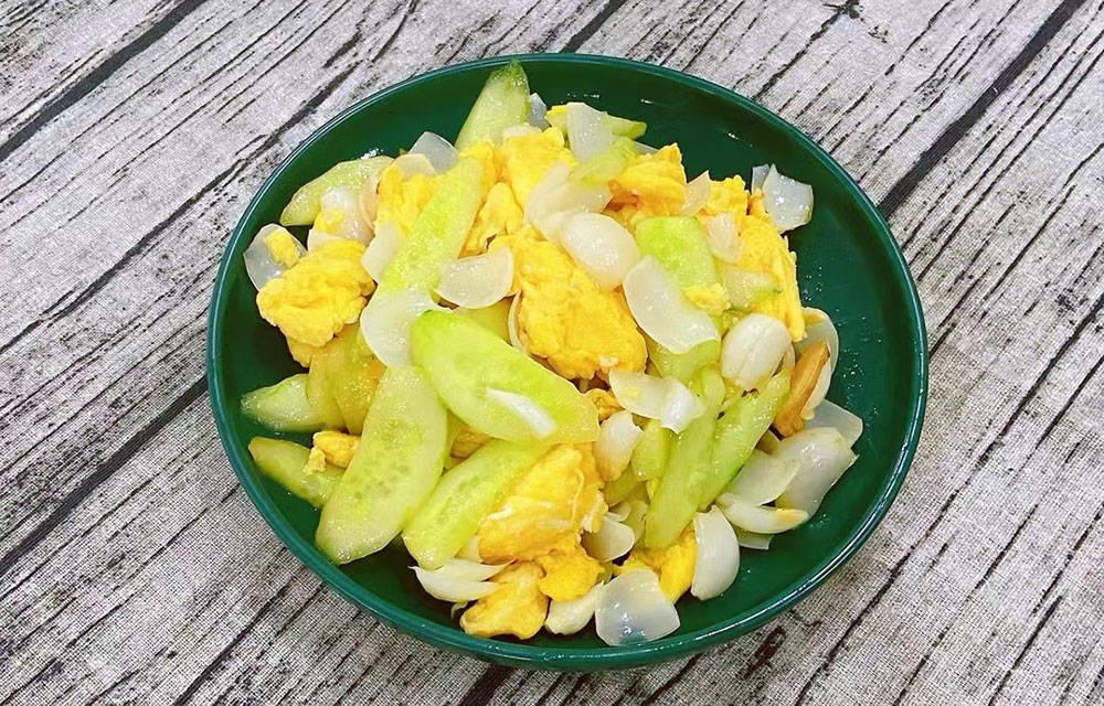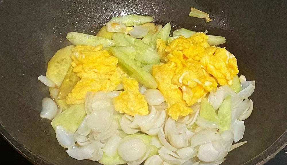 5、接着在底油中放些葱蒜,黄瓜和百合都倒进去,快速炒一会儿,直到熟透,鸡蛋重新倒里边,均匀撒点盐,炒入味后,马上关火装盘。