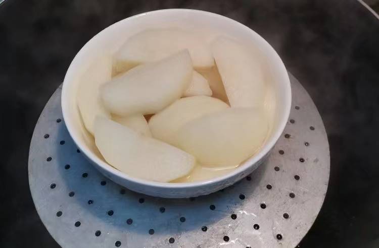 3、接着把碗端上蒸屉,用隔水加热的方式来烹调,时间要久一些,四十分钟左右,将其彻底蒸透。届时果肉看起来微透明,往往渗着汤汁。稍微晾一会儿,温热的状态时去吃。入口绵密,汁水香甜,特别滋润。
