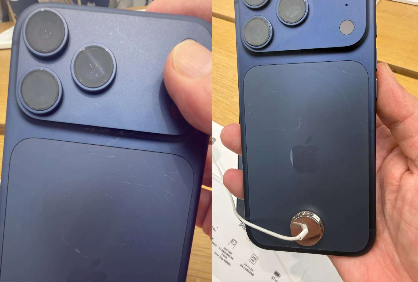 根据网友在社交平台的分享,Apple Store 里面的一些展示机已经出现了明显划痕,甚至有网友刚开箱的零售版 iPhone 17 Pro 出现边框小凹陷的情况。