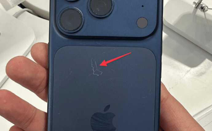 但需要注意的是,部分网友晒出的照片显示,背面玻璃材质的苹果 Logo 区域同样存在划痕,从形态来看更像是外力人为损伤,比如用钥匙划伤导致。