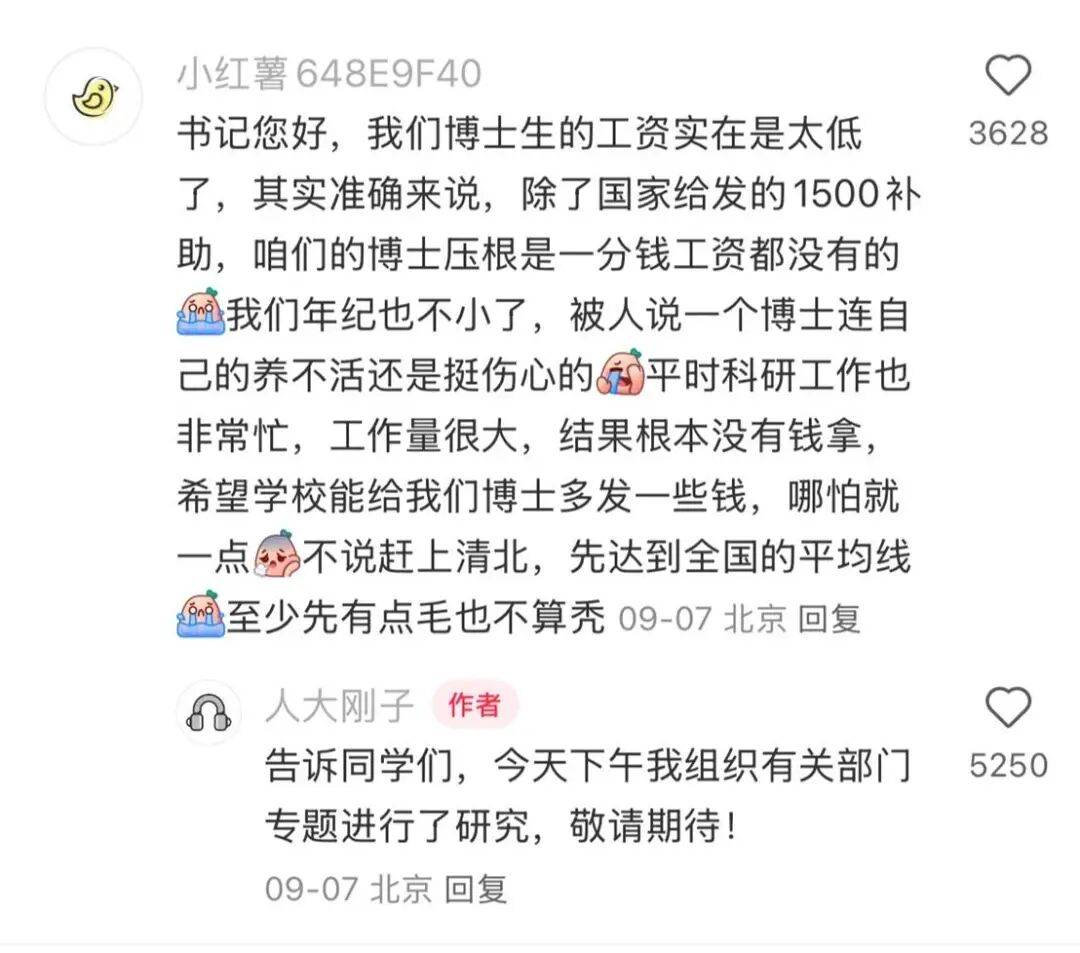 有人大学生提出,希望提高博士生工资,“刚子”在评论区回复:“告诉同学们,今天下午我组织有关部门专题进行了研究,敬请期待!”