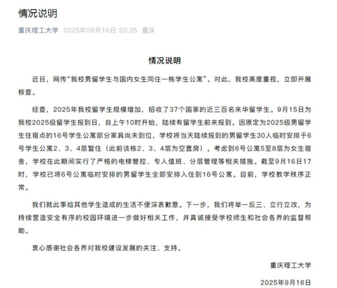 就在9月15日,有网友发帖称,重庆理工大学两江校区6栋女生宿舍安排了男性留学生入住,引发关注。