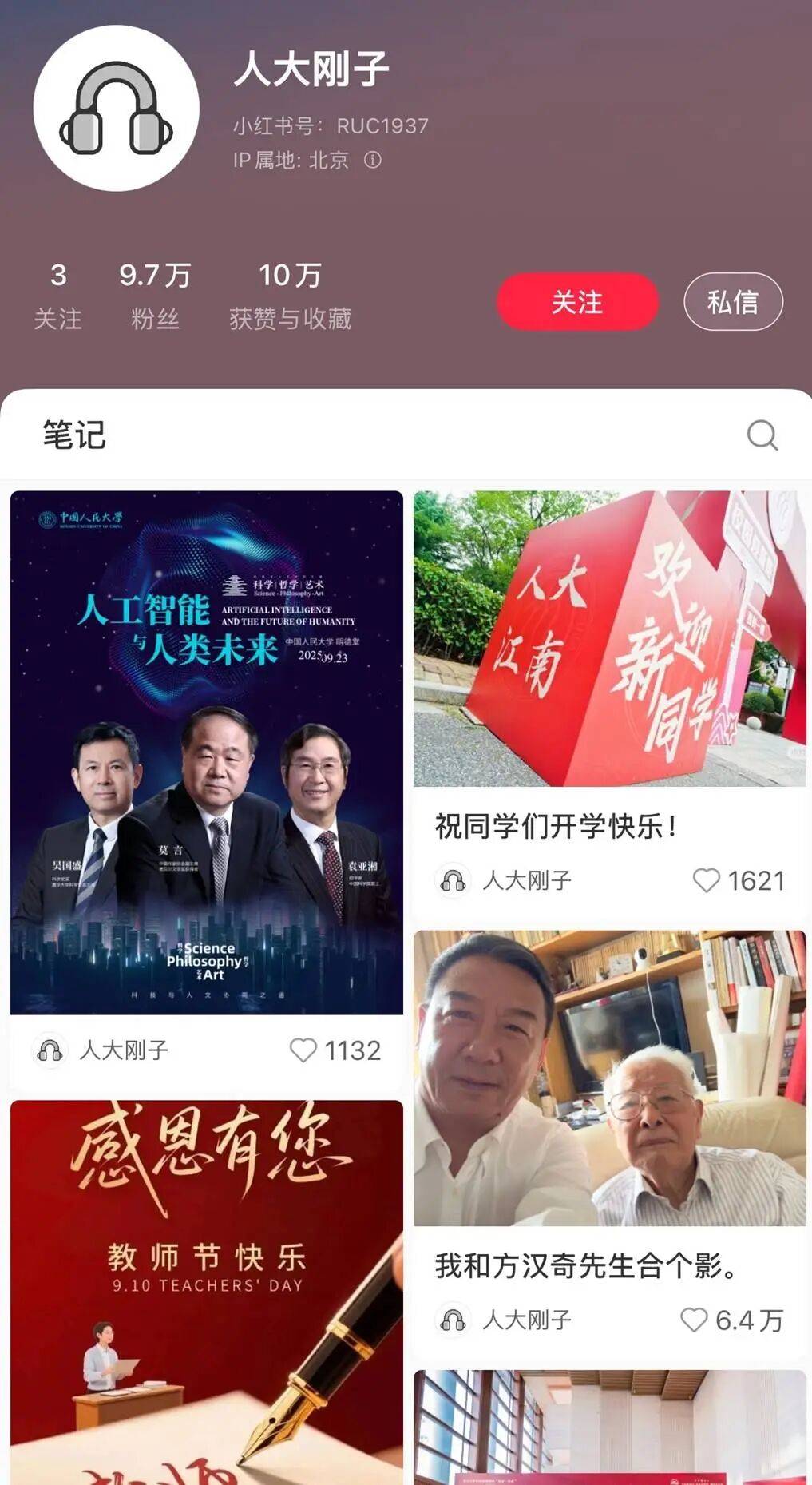 近日,中国人民大学党委书记张东刚开通社交媒体小红书账号,ID名为“人大刚子”。短短几天,“人大刚子”从起号就迅速成为“网红”。截至9月19日,不到半个月时间,“人大刚子”已经收获了9.7万粉丝,超过了人大小红书的官方账号。